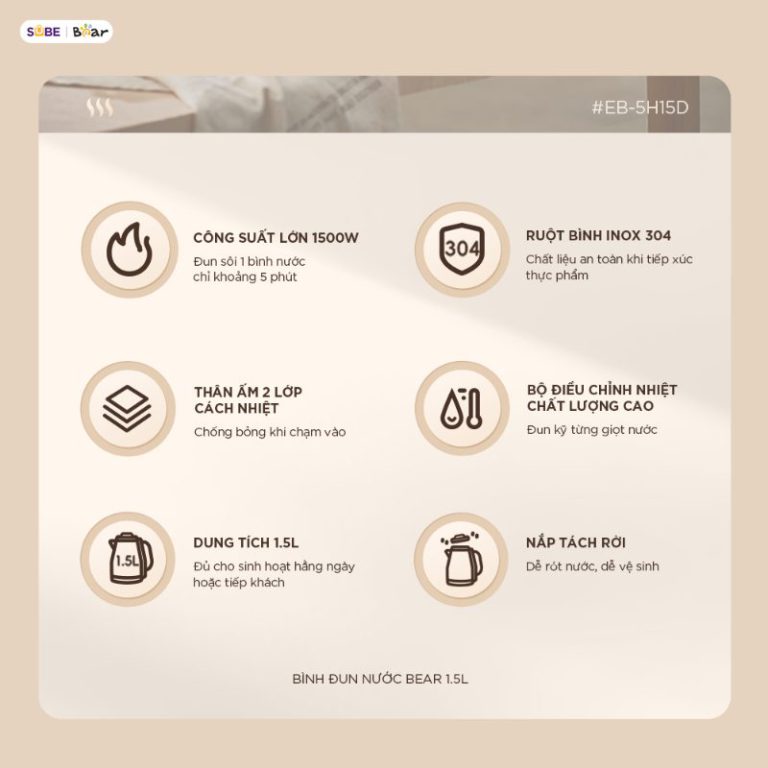 Dù mới ra mắt thị trường Việt Nam chưa lâu nhưng ấm đun nước Bear 1.5L EB-5H15D đã nhận được “cơn mưa lời khen” từ khách hàng. Tất cả là nhờ những ưu điểm nổi bật sau: