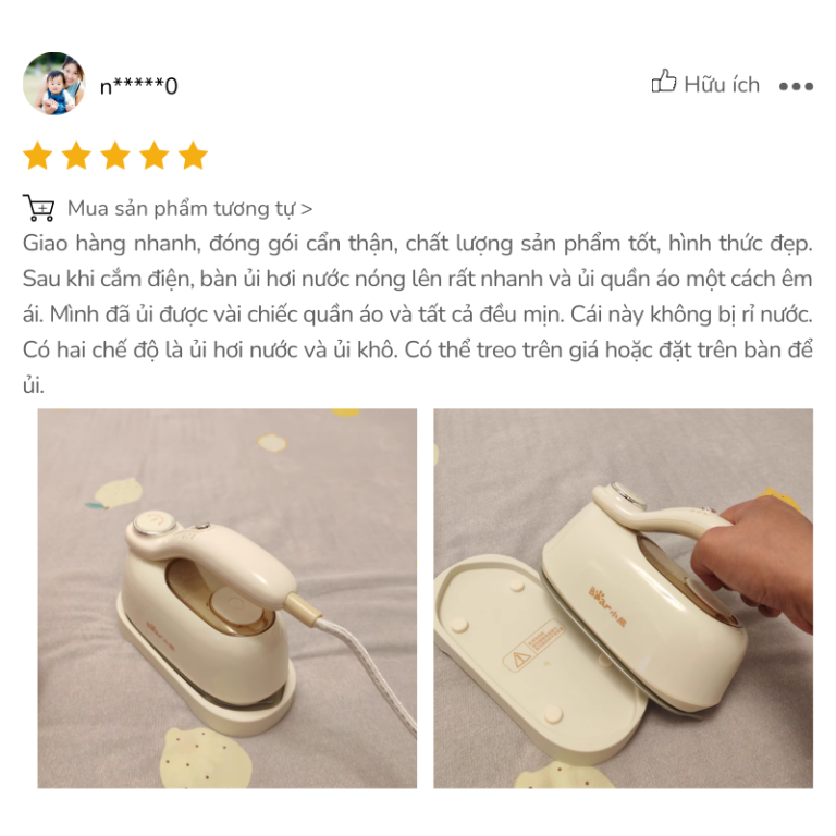 Khách hàng từng sử dụng bàn là Bear IR-4H15H đều cho sản phẩm 5/5 sao. Giao diện 10 điểm, 2 chức năng ủi khô – ủi ướt 10 điểm. Đặc biệt là khả năng là phẳng mịn nhanh chóng của sản phẩm. Cùng xem một số đánh giá của chị em về sản phẩm bàn là IR-4H15H nhé.