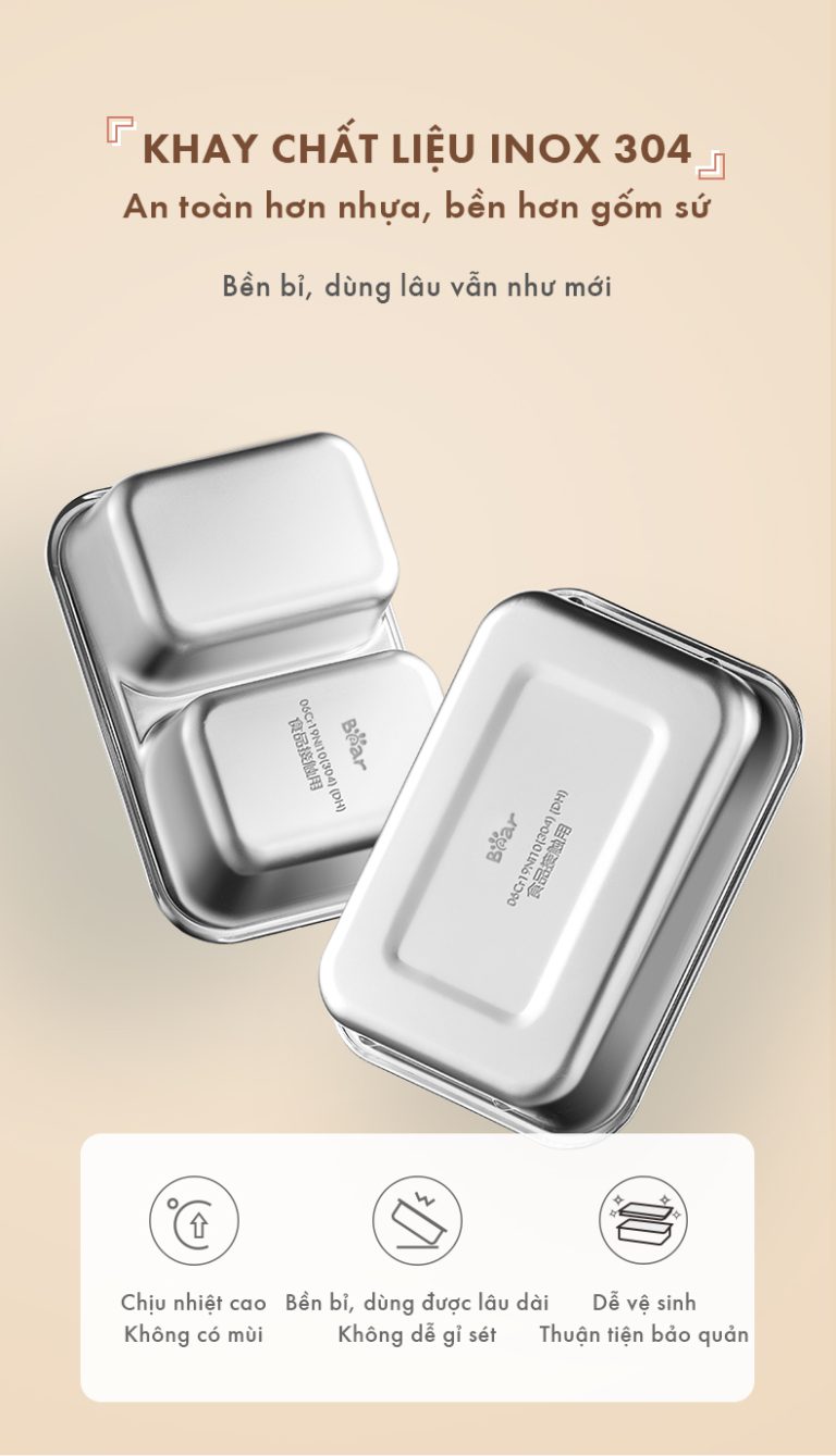 - An toàn cho sức khỏe: Khay đựng thực phẩm làm bằng inox 304 cao cấp. Chất liệu này không gỉ sét, không thôi nhiễm các chất độc hại vào thức ăn ngay cả khi tiếp xúc với nhiệt độ cao và thực phẩm có tính axit, mặn.