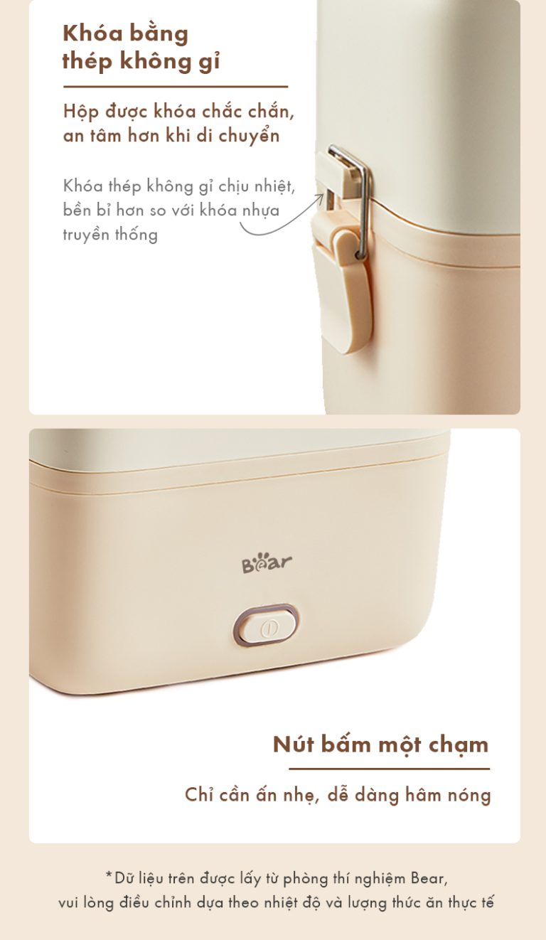 - Thao tác 3 bước: Chỉ cần đậy nắp – nhấn nút xả khí – khóa chặt, bạn đã có thể yên tâm mang bữa trưa đi khắp nơi mà không cần lo lắng.