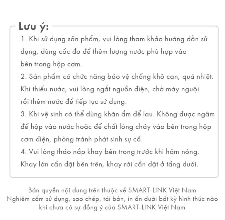 | Bộ sản phẩm bao gồm | Hộp chính*1, cốc đo lường*1, nắp*1, khay trên*1, khay dưới*1, nắp khay*2, dây điện rời*1, hướng dẫn sử dụng*1 |