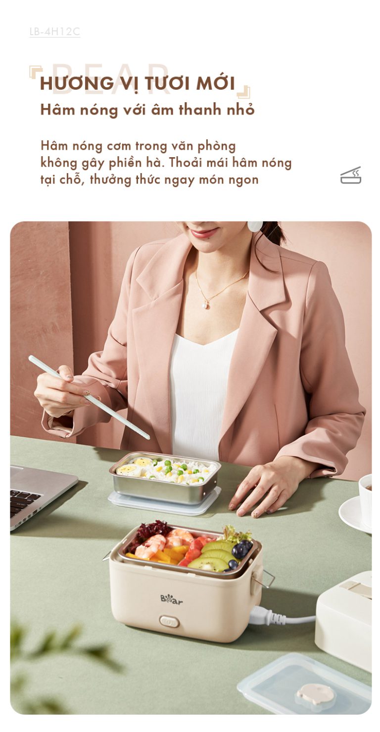 Hộp cơm điện Bear 1.2L LB-4H12C là lựa chọn lý tưởng không chỉ cho dân văn phòng mà còn cho sinh viên hay những buổi dã ngoại, picnic cuối tuần cần một bữa ăn nóng hổi, chất lượng.