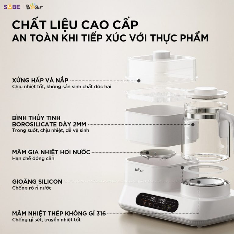 - Công nghệ SilicoFusion: Máy không sử dụng keo dán. Bình thủy tinh và mâm nhiệt được kết nối bằng vòng silicone thực phẩm, đảm bảo không rò rỉ, an toàn tuyệt đối.