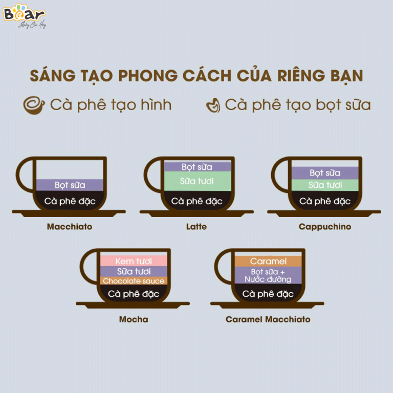 • Trổ tài Barista tại gia: Từ Cappuccino béo ngậy, Latte ngọt ngào đến Macchiato đậm đà hay Mocha quyến rũ, Bear CF-B02V1 giúp bạn thỏa sức sáng tạo những thức uống cà phê đẳng cấp như ngoài quán.