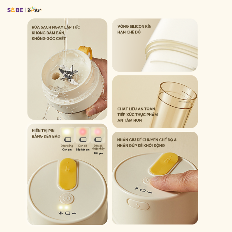 – Đèn báo hiệu: Máy xay sinh tố này được trang bị đèn báo hiệu mức độ pin. Khi máy yếu pin, đèn sẽ nhấp nháy màu đỏ để thông báo. Khi pin đủ để khởi động máy, đèn sẽ nhấp nháy màu trắng. Khi pin đã được sạc đầy, đèn trắng sẽ sáng liên tục.