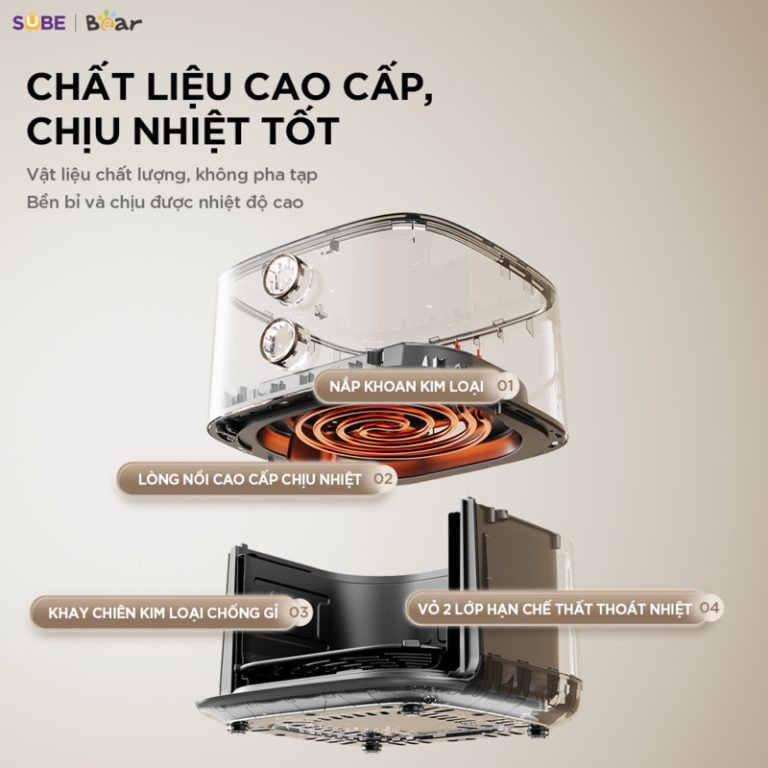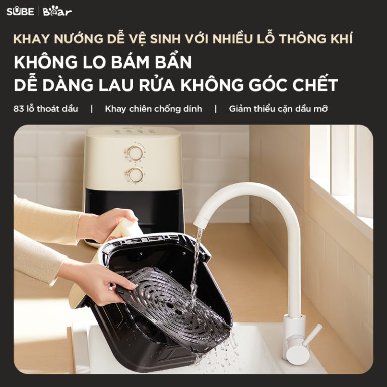 - Thiết kế tối ưu: Khay chiên được thiết kế “lơ lửng”, tạo một khoảng trống với đáy nồi, cho phép luồng khí nóng lưu thông dễ dàng.
