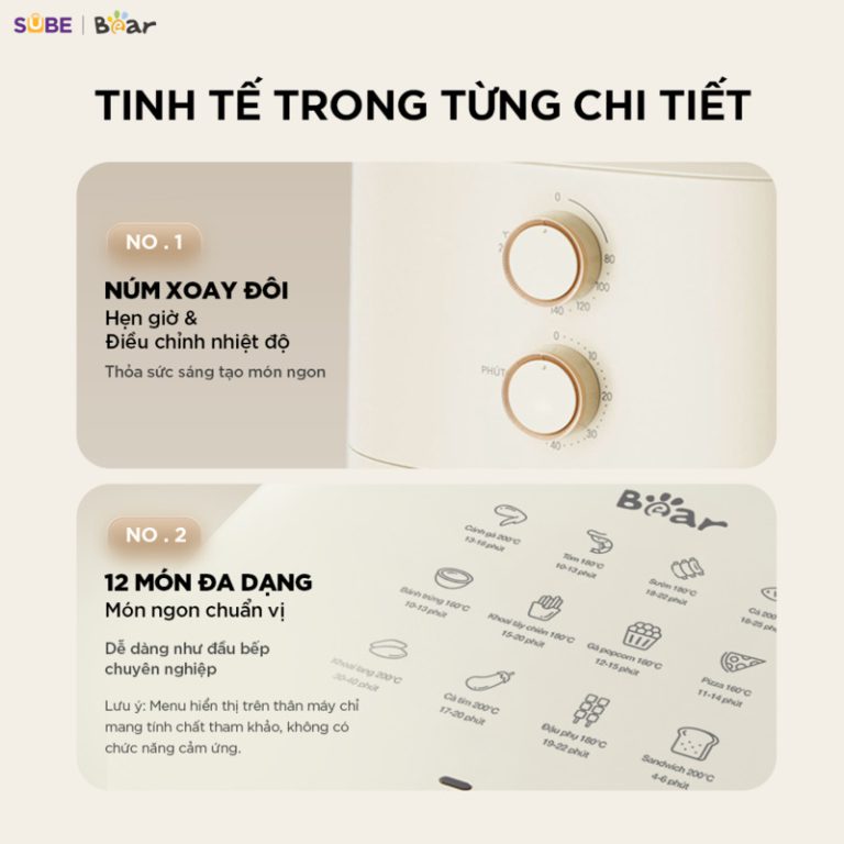 Từ việc không cần lật thức ăn đến việc dễ dàng theo dõi món ăn qua cửa kính, mỗi tính năng của nồi chiên không dầu Bear 5L AF-5H15I52 đều giúp bạn nấu ăn ngon hơn và nhàn hơn. Hãy cùng xem qua 7 điểm nổi bật nhất của chiếc nồi này.