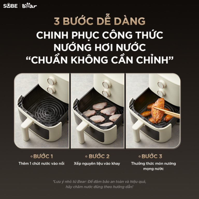 - Bước 3 – Hoàn thành: Nồi sẽ tự động hoạt động. Khi hết thời gian, nồi sẽ phát ra tiếng “ting” báo hiệu món ăn đã sẵn sàng. Kéo khay chiên ra và thưởng thức thành quả nóng hổi, giòn ngon.
