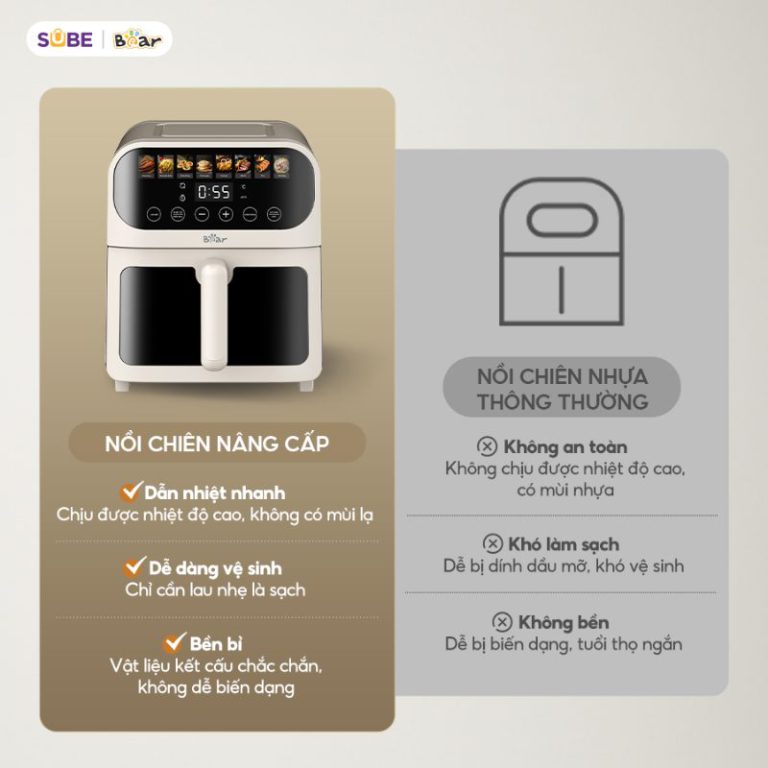- Giữ nguyên hương vị tự nhiên: So với cách làm truyền thông, việc sử dụng nồi chiên không dầu Bear giúp chín nhanh. Nhờ đó, vitamin, khoáng chất hạn chế thất thoát.